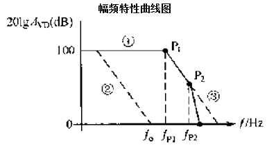 AD8544的內(nèi)部是一個(gè)多級(jí)放大器。其對(duì)數(shù)幅頻特性如圖1所示中的曲線①(實(shí)線)。對(duì)數(shù)幅頻特性曲線在零分貝以上的轉(zhuǎn)折點(diǎn)稱為極點(diǎn)。圖中,稱P1 P2點(diǎn)為極點(diǎn)。極點(diǎn)對(duì)應(yīng)的頻率稱為轉(zhuǎn)折頻率,如fp1,fp2,第一個(gè)極點(diǎn),即頻率最低的極點(diǎn)稱為主極點(diǎn)。 在極點(diǎn)處,輸出信號(hào)比輸入信號(hào)相位滯后45°,幅頻特性曲線按-20dB/10倍頻程斜率變化,每十倍頻程輸出信號(hào)比輸入信號(hào)相位滯后90。極點(diǎn)越多,越容易自激,即越不穩(wěn)定。為使集成運(yùn)放工作穩(wěn)定,需進(jìn)行相位(頻率)補(bǔ)償。