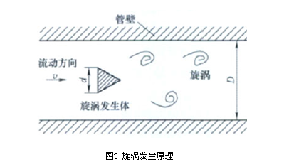 渦街流量計的測量主體是非流線型旋渦發(fā)生體。當(dāng)流體流過旋渦發(fā)生體時,在發(fā)生體兩側(cè)會交替地產(chǎn)生旋渦,并在它的下游形成規(guī)則的兩列不對稱的旋渦列,如圖3所示。