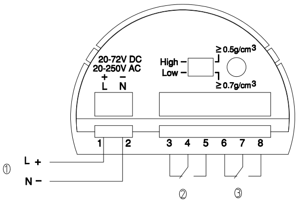 ①密度開關(guān) ② 高低位模式 ③ 指示燈 ④ 接線端子 ⑤ 接地端子