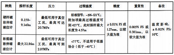 表1 硬桿磁致伸縮液位計(jì)和軟纜磁致伸縮液位計(jì)的主要參數(shù)